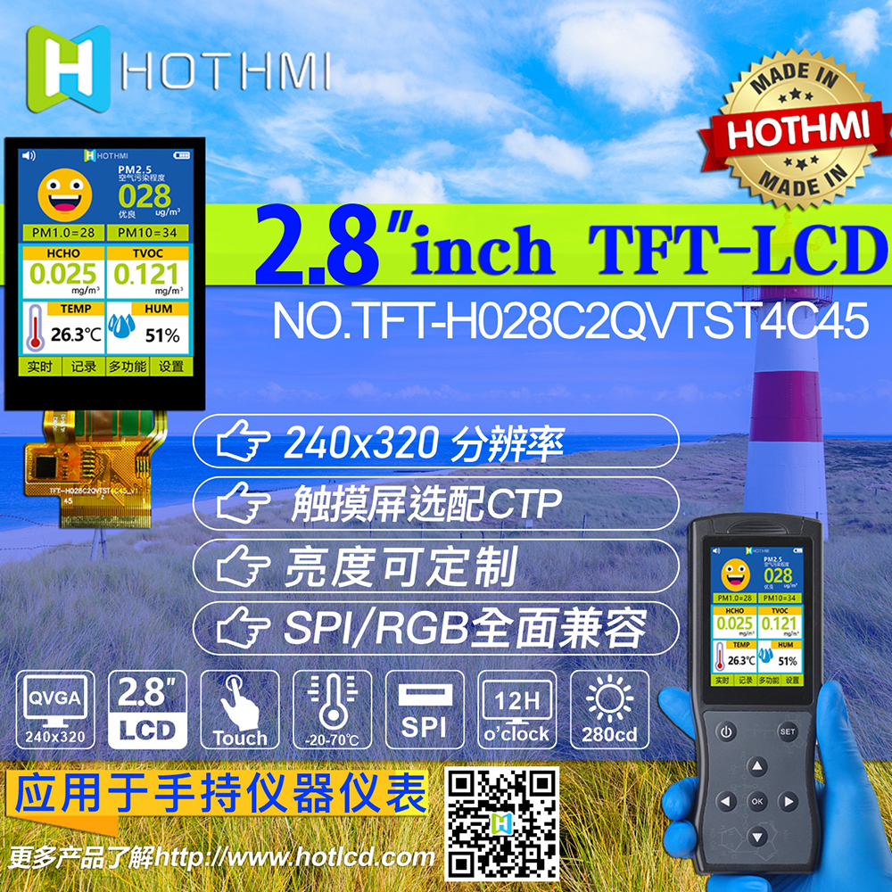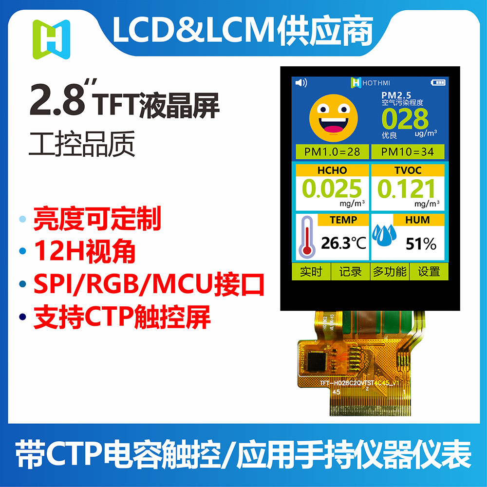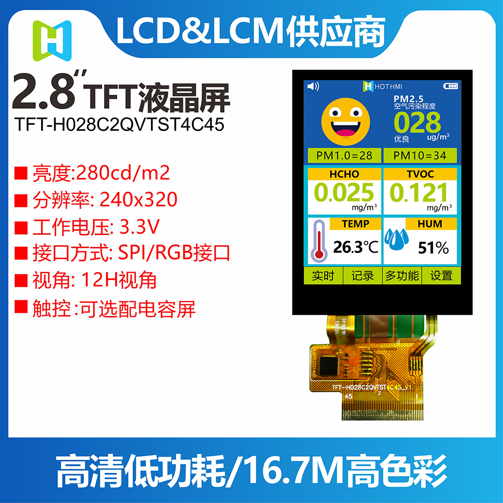 Location:Home  >  Product center  >  TFT display  >  TFT display standard products | Full-view TFT color screen | High-brightness series TFT  >  2.8寸TFT/240*320分辨率/12H視角/全兼容接口/帶CTP電容觸控/TFT-H028C2QVTST4C45