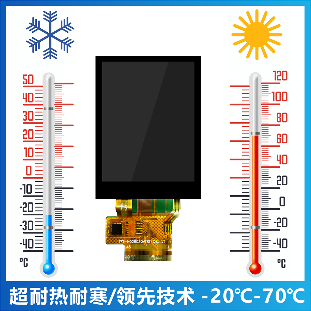 The TFT-H028C2QVTST2C45 is a 2.8-inch wide temperature IPS TFT-LCD display with projected capacitive touchscreen with a resolution of 240x320 pixels. The module has built-in ST7789V driver IC and supports SPI/RGB/MCU fully compatible interface. TFT-H028C2QVTST2C45 adopts IPS panel, which has the advantage of wider viewing angle, left: 80 / right: 80 / top: 80 / bottom: 80 degrees (typ.), contrast ratio 800:1 (typ.), brightness 280 nits (typ. value), glare panel, 16:9 aspect ratio. The touch screen has built-in FT6336U IC, which supports I2C interface and multi-touch function. The H028C2Q model has a projected capacitive touch panel (PCAP) but no touch panel option (TFT-H028C2QVTST3N45). The supply voltage (VCC) of the TFT-H028C2QVTST2C45 is 3.0V to 3.6V, with a typical value of 3.3V. It can work at temperatures from -20°C to +70°C and storage temperatures from -30°C to +80°C. 2.8 inch TFT color screen /240*320 resolution /12H White LED /RGB/SPI/MCU interface /TFT-H028C2QVTST2C45/used in handheld instruments