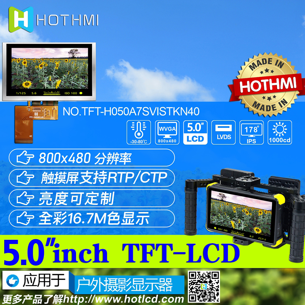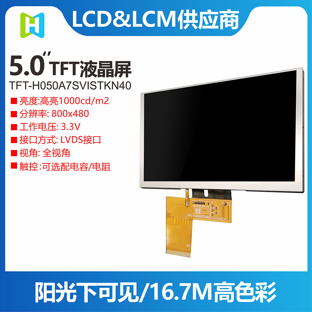 Location:Home  >  Product center  >  TFT display  >  TFT display standard products | Full-view TFT color screen | High-brightness series TFT  >  5.0寸TFT彩色液晶屏/800*480分辨率/全視角IPS工藝|高亮 陽(yáng)光下可視/LVDS接口/TFT-H050A7SVISTKN40