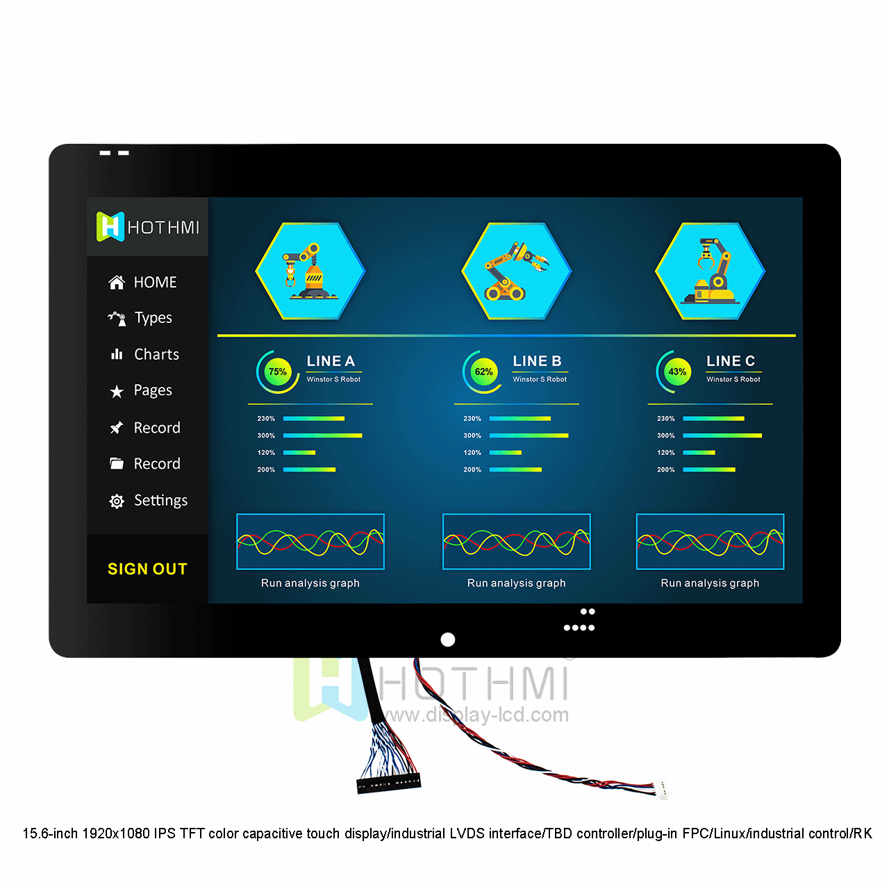 This standard 15.6-inch TFT LCD display TFT-H156FHDI8C30-LVDS has a resolution of 1920x1080 pixels, IPS full viewing angle, and high-quality effects regardless of viewing direction. The standard brightness LED backlight brightness is 850 nits. Although this transmissive LCD has a touch screen, the compact size, 3.3V low-voltage power supply, and impressive display quality make it an excellent choice for projects that require portrait mode visual output without touch function.