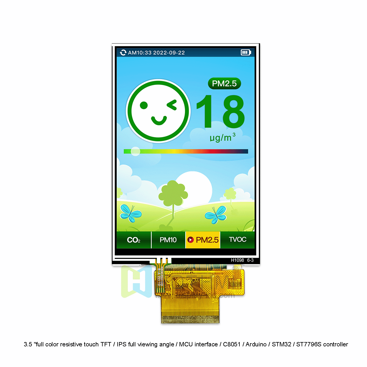 3.5-inch 320x480 dot matrix TFT LCD display / 3.5 "full color resistive touch TFT / IPS full viewing angle / MCU interface / C8051 / Arduino / STM32 / ST7796S controller Model TFT-H035A5HVTST2R45 is an IPS full viewing angle display with high picture quality, high contrast and wide color gamut. Its resolution is 320x480, with built-in ST7796S controller. This model is with resistive touch function, supports MCU interface, 65K/262K true color, FPC connection (optional connector), 3.3V voltage. Hot Display's display has a wide operating temperature range, and the operating temperature range of this product is -20 ℃ ~ +70 ℃. All materials meet environmental protection requirements and RoHS standards. This module is widely used in various instruments, smart devices, etc., and is suitable for systems such as Arduino.