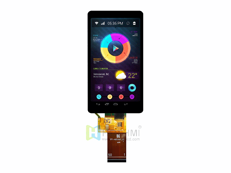 5.5-inch IPS full-view TFT/720X1280 resolution color display/NV3051 controller/high brightness TFT TFT-H055A61HDINVKN40 TFT 720x1280 70.6x128.25 5.5 5.5 68.04x120.96 IPS 1000cd/m2 FPC-50pin MIPI Anti-static ESD 8KV -20~70℃ 5.0V NV3051F<TFT>,GT911<CTP>