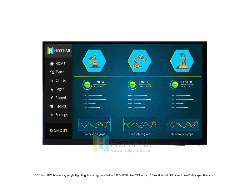 10.1-inch IPS high brightness 1920x1200 pixel TFT color LCD module with HI driver board HTM-H101A4-HI HI driver-free module 1920x1200 230.2x150.0x4.4 10.1 10.1 216.81x135.5 IPS 1000cd/m2 HI Anti-static ESD 8KV -20~60℃ 12V
