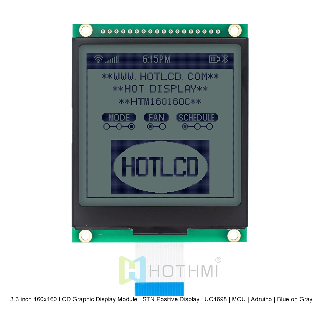 3.3 英寸 160x160 LCD 圖形顯示屏在灰色背景上顯示藍色像素。這款全透式 LCD 顯示屏經過精心設計,在明亮環(huán)境中,通過偏光片的反射性,將圖像反射給觀賞者,在較暗的環(huán)境中,LCD 內置強背光,可提供高對比度并向觀看者顯示清晰的圖形。這種先進的顯示技術可確保顯示屏始終易于閱讀,無論照明條件如何。