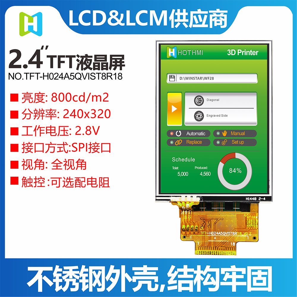 產(chǎn)品描述 TFT-H024A5QVTST8R18 是一款 2.4 英寸寬溫 IPS TFT-LCD 顯示器,帶有投射電阻式觸摸屏,分辨率為 240x320 像素。 模塊內(nèi)置ST7789V驅(qū)動(dòng)IC,支持SPI接口。 TFT-H024A5QVTST8R18采用IPS面板,具有視角更廣的優(yōu)勢(shì),左:80/右:80/上:80/下:80度(典型),對(duì)比度800:1(典型),亮度800尼特(典型) ) 值),眩光面板,16:9 縱橫比。 H024A5 型號(hào)具有投射電阻式觸控面板 (PCAP), TFT-H024A5QVTST8R18的供電電壓(VCC)為3.0V至3.6V,典型值為3.3V。 它可以在 -30°C 到 +80°C 的溫度和 -30°C 到 +80°C 的存儲(chǔ)溫度下工作。