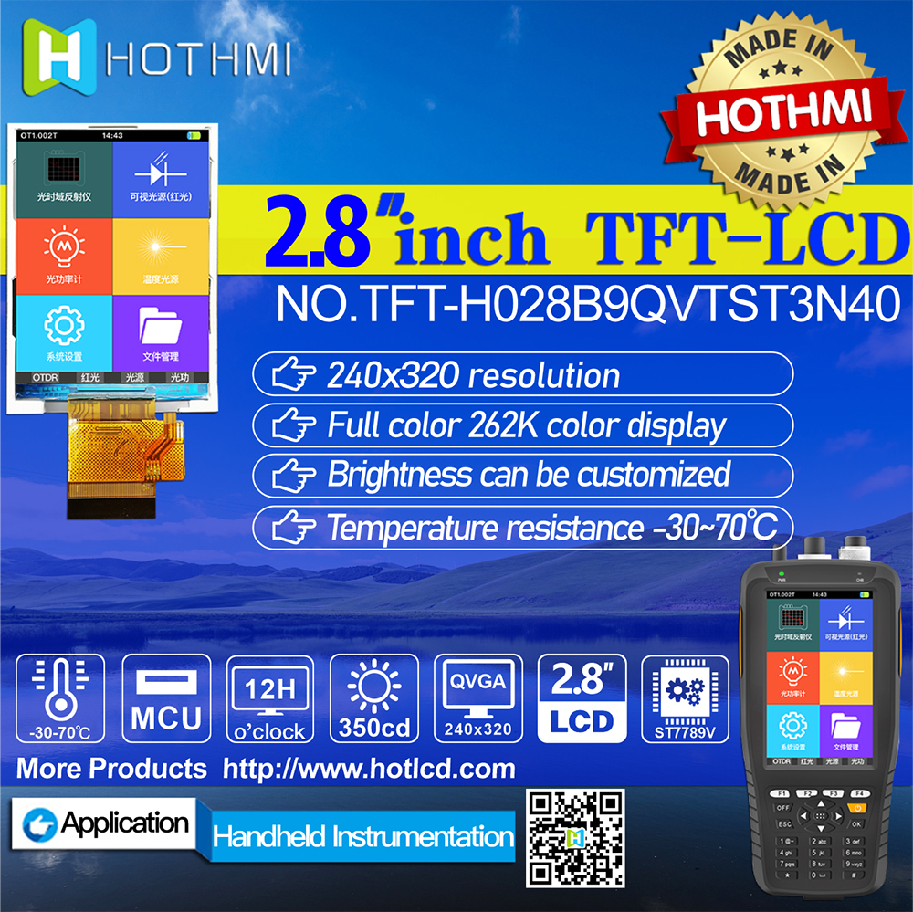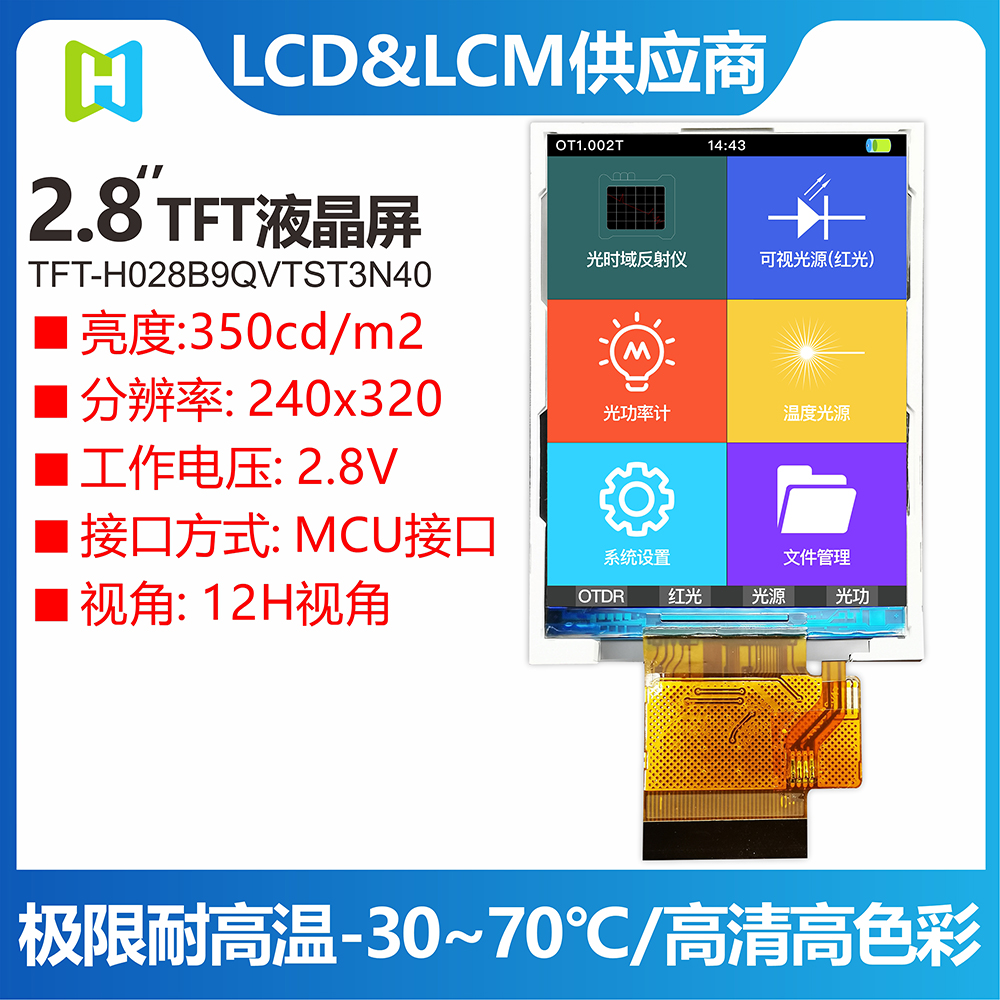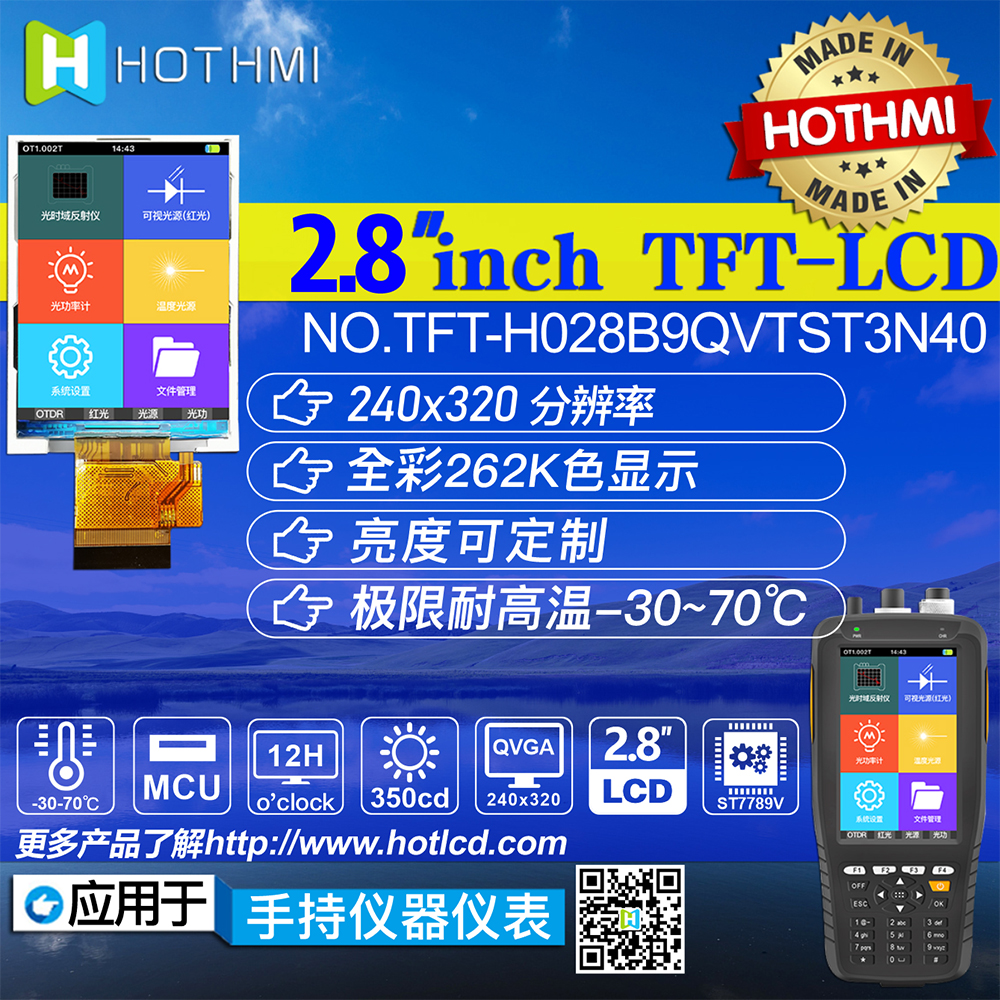 TFT-H028B9QVTST3N40是HOTLCD研發(fā)團(tuán)隊(duì)精心設(shè)計(jì)的2.8英寸TFT彩色液晶屏,240*320分辨率,高畫質(zhì),廣視角,65K/262K真彩色,內(nèi)置ST7789V控制器,支持MCU接口,40PIN外掛FPC可以接主板(可選接頭),單電源DC 2.8V供電。 TFT 模塊可配備觸摸屏,所有材料均符合 RoHS 標(biāo)準(zhǔn)。 廣泛應(yīng)用于各種儀表、智能設(shè)備、分析儀器、手持儀表、行車記錄儀等:8051、PIC、AVR、ARDUINO、ARM、樹莓派等。