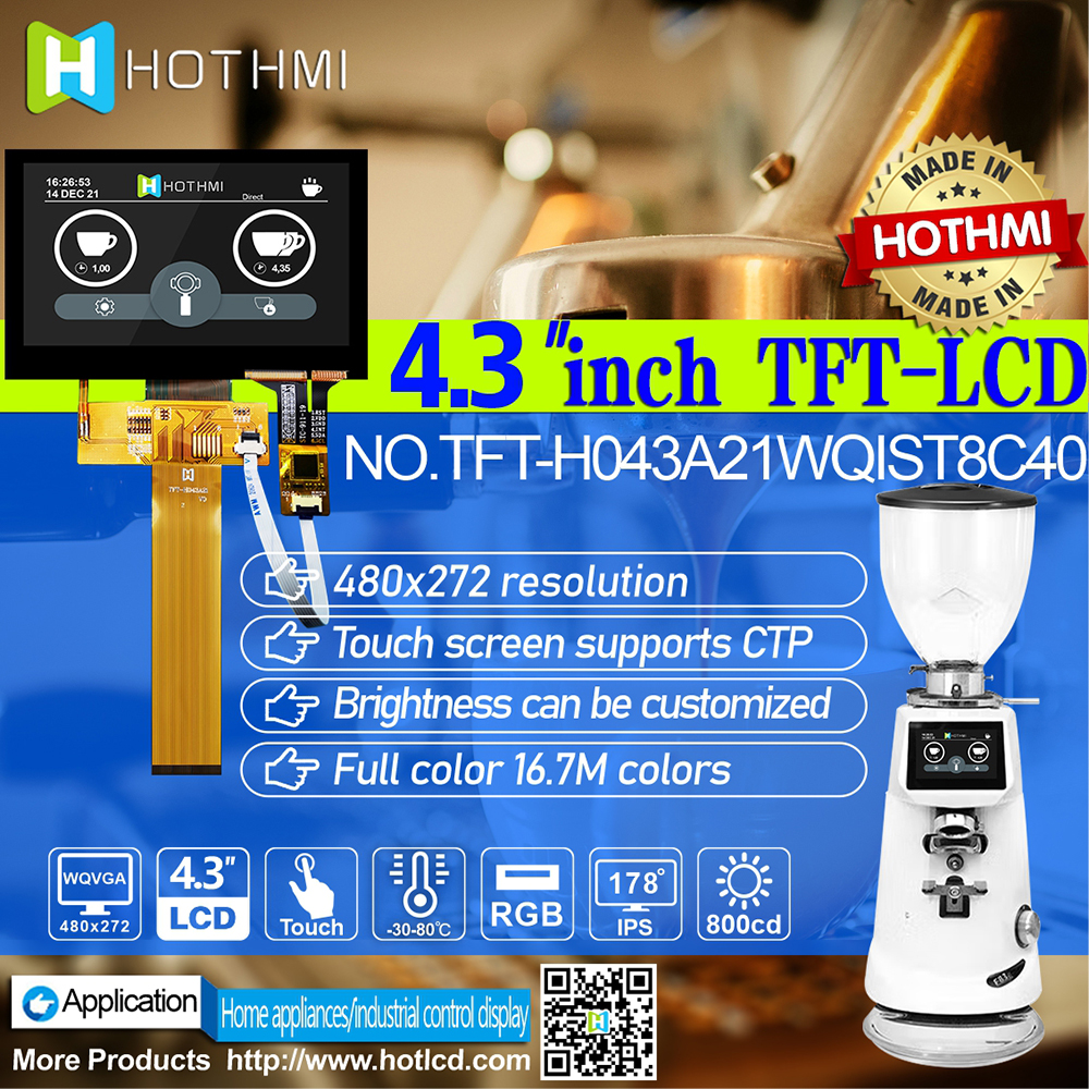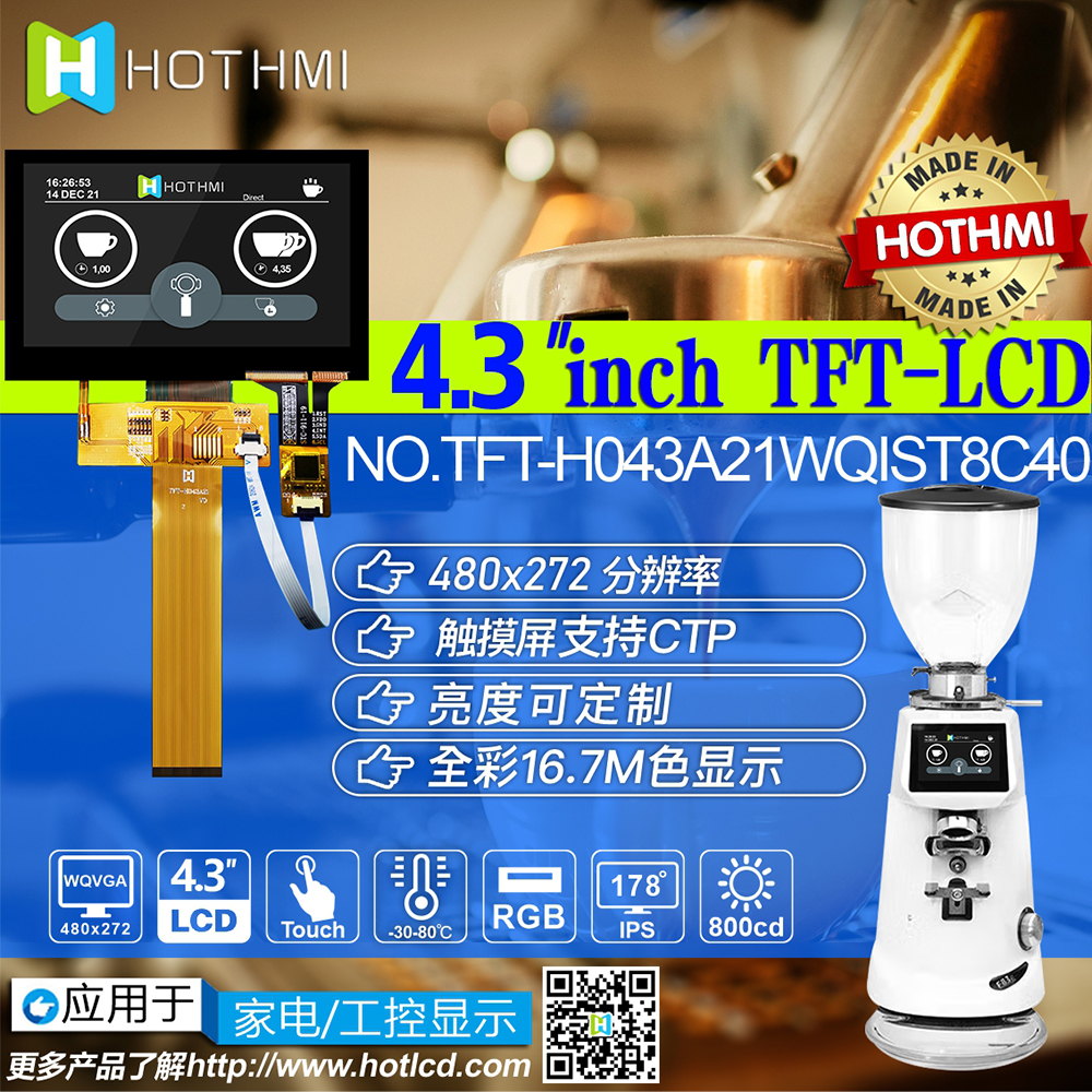 4.3寸TFT彩屏 /480*272分辨率 /全視角IPS工藝 /RGB 24Bit/IIC接口 /TFT-H043A21WQIST8C40/應(yīng)用于咖啡機,家電,工控,醫(yī)療顯示設(shè)備,陽光下可見