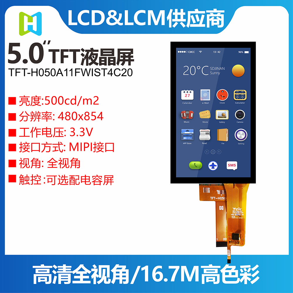TFT-H050A11FWIST4C20 是一款 5.0 英寸寬溫 IPS TFT-LCD 顯示器,帶有投射電容式觸摸屏,分辨率為 480x854 像素。 模塊內(nèi)置ST7701驅(qū)動IC,支持MIPI接口。 TFT-H050A11FWIST4C20采用IPS面板,具有視角更廣的優(yōu)勢,左:80/右:80/上:80/下:80度(典型),對比度800:1(典型),亮度500尼特(典型) ) 值),眩光面板,16:9 縱橫比。 觸摸屏內(nèi)置GT911 IC,支持I2C接口和多點(diǎn)觸控功能。 H050A11 型號具有投射電容式觸控面板 (PCAP),但沒有觸控面板選項(xiàng) (TFT-H050A11FWIST5N20)。 TFT-H050A11FWIST4C20的供電電壓(VCC)為3.0V至3.6V,典型值為3.3V。 它可以在 -20°C 到 +70°C 的溫度和 -30°C 到 +80°C 的存儲溫度下工作。