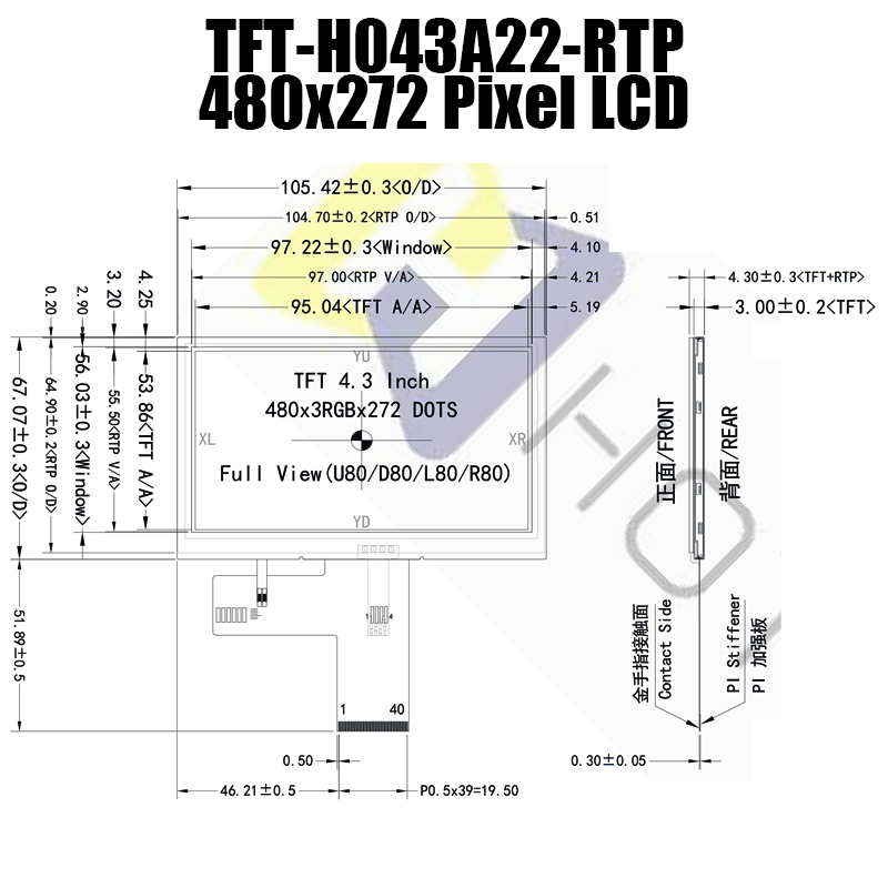 • 型號: 4.3 寸SPI TFT彩屏 | 480x272點(diǎn)陣| 陽光下可讀|4線電阻式觸摸屏 | MCU TFT 顯示屏 /TFT-H043A22WQIST8R40