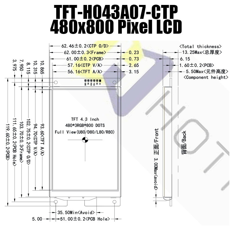 4.3寸 TFT彩屏帶板模組 480x800 智能串口屏 電容觸控屏顯示器 HTM-TFT043A07-UART