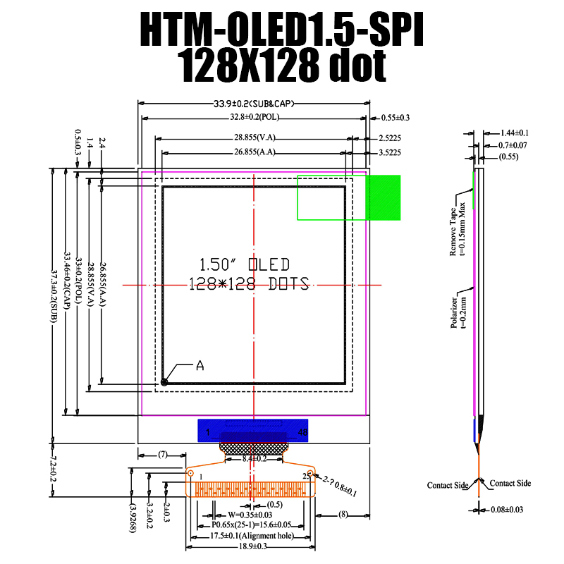 該顯示模塊的分辨率為 128x128 點,可提供令人難以置信的清晰度和細節(jié)。 A.A 區(qū)域尺寸為 26.855x26.855mm,提供充足的空間來展示您的內(nèi)容。 其 33.9x37.3mm 的緊湊尺寸使其非常適合空間受限的應用。