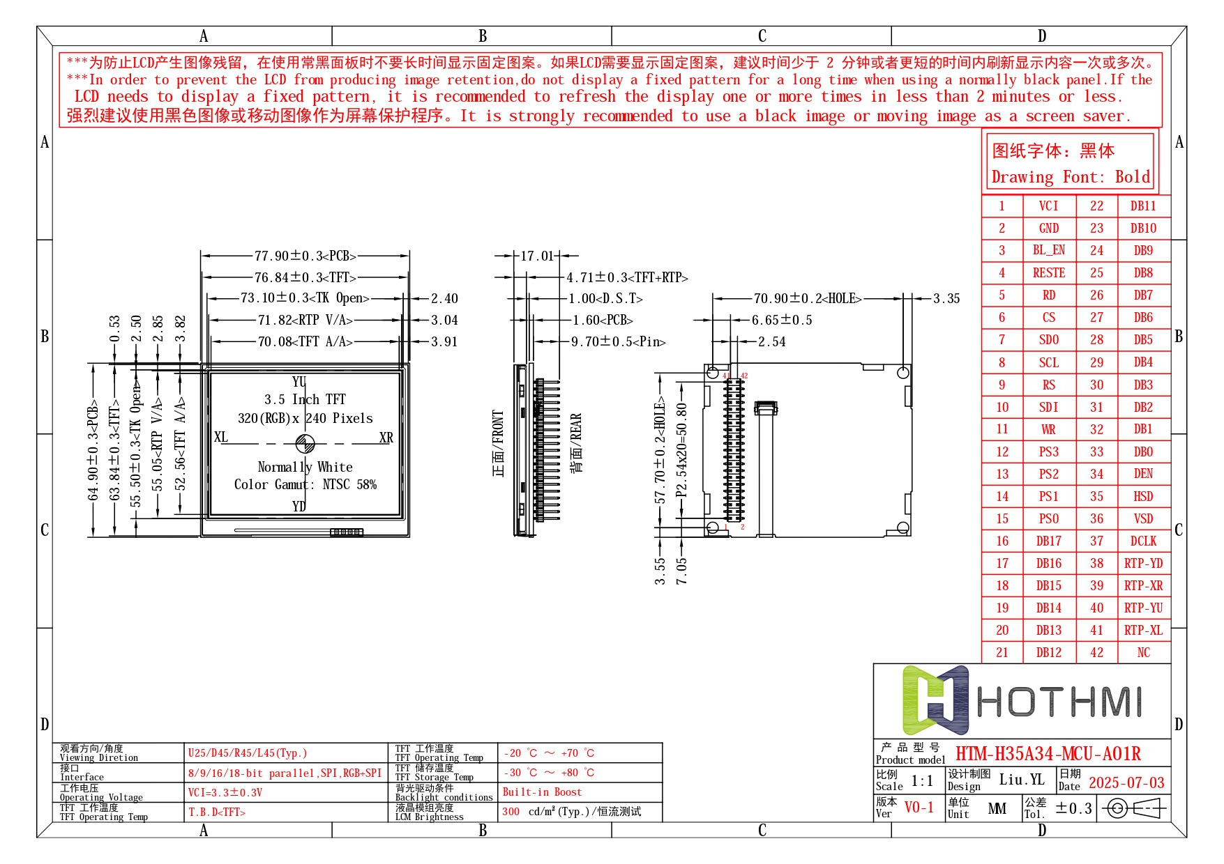 | 3.5寸TFT液晶模組/4-Line SPI串口/LCM-TFT035C1HVS4LN8D-V01 | TFT LCM | 320x480 |